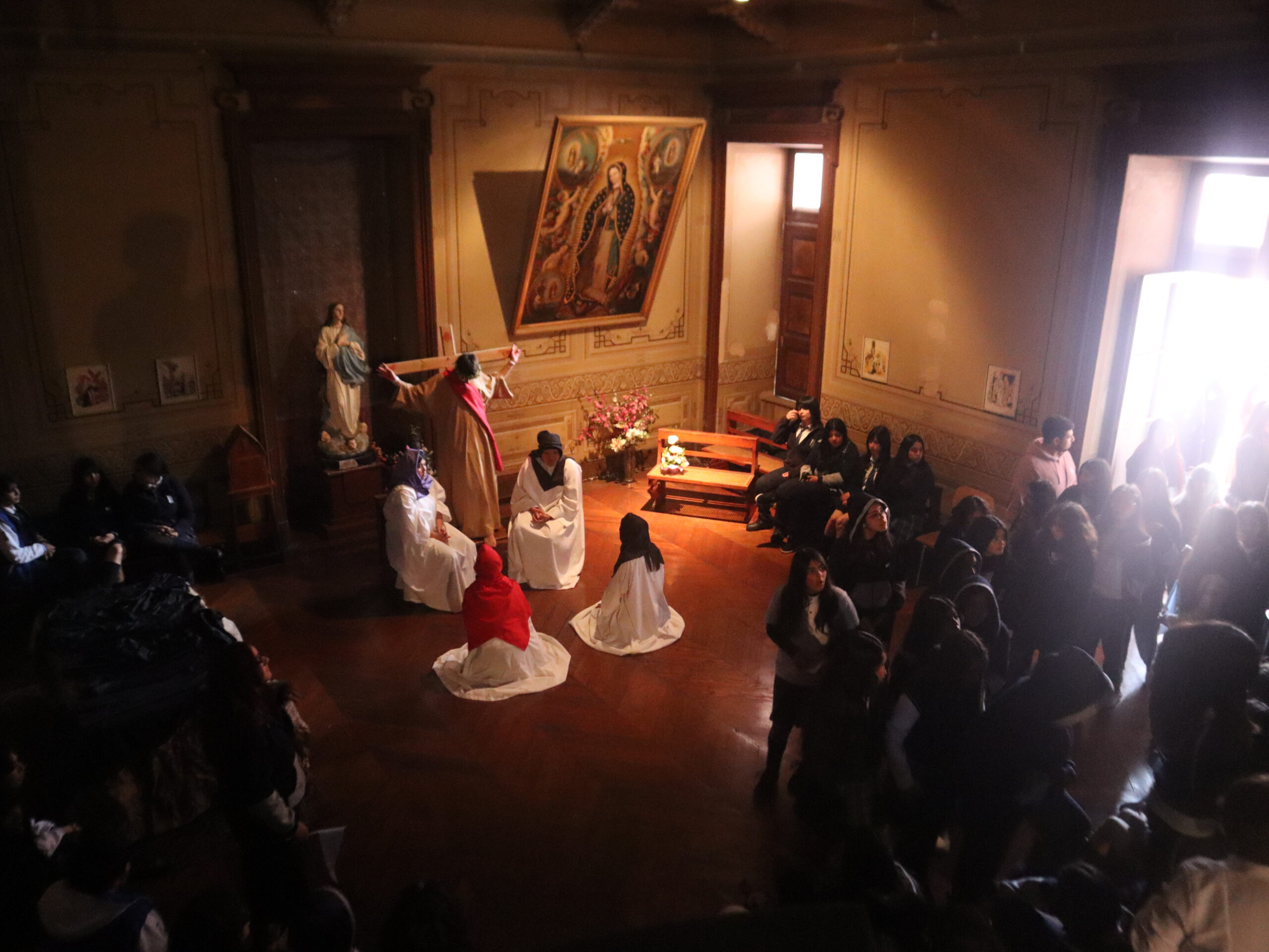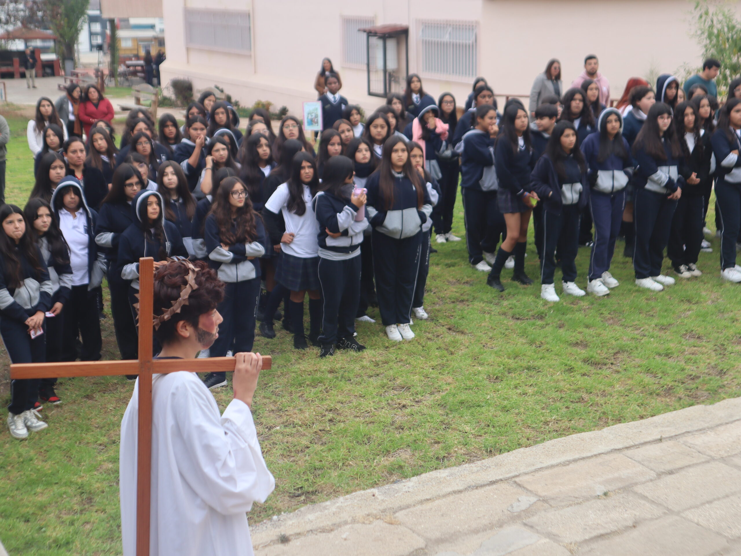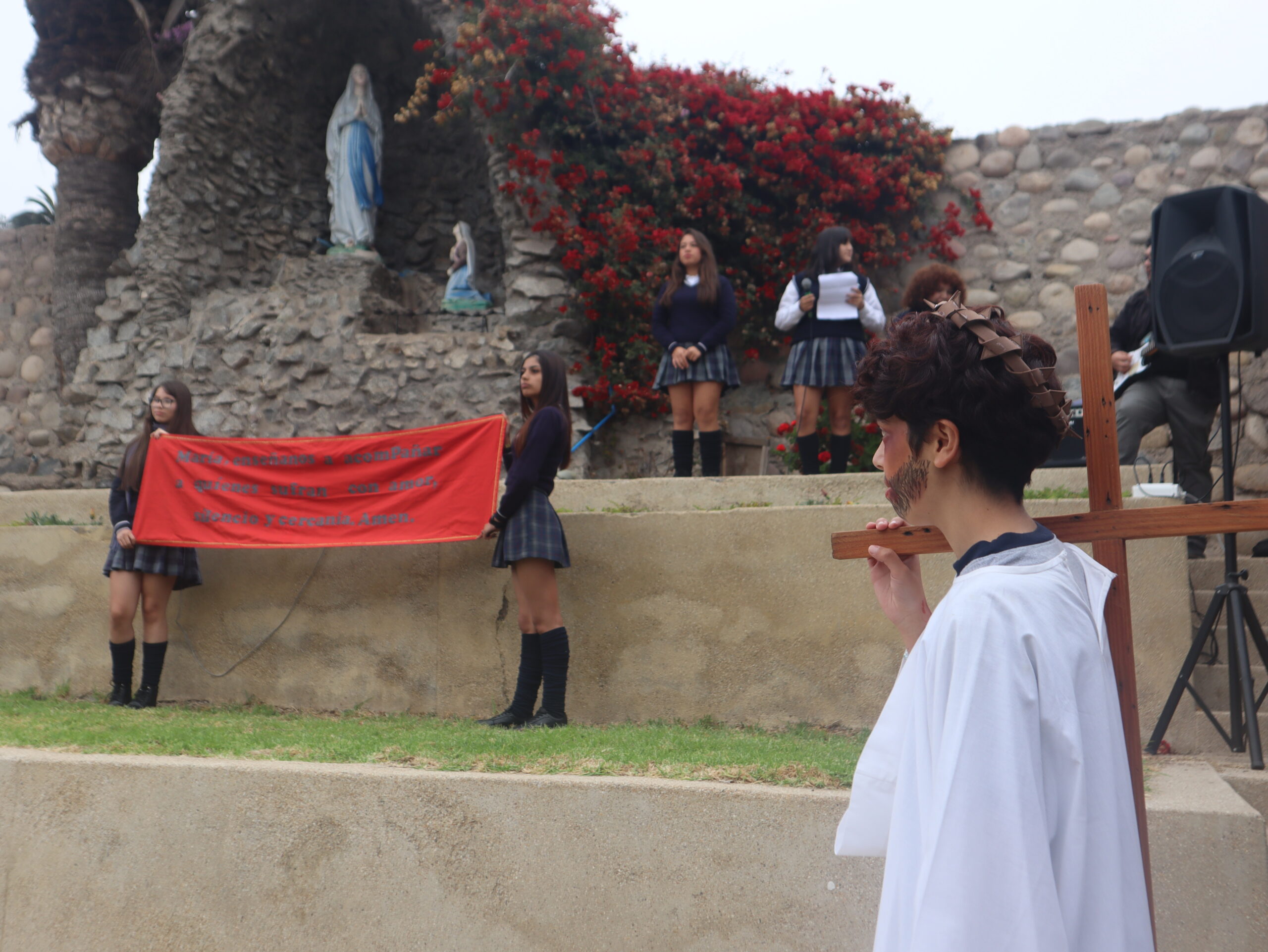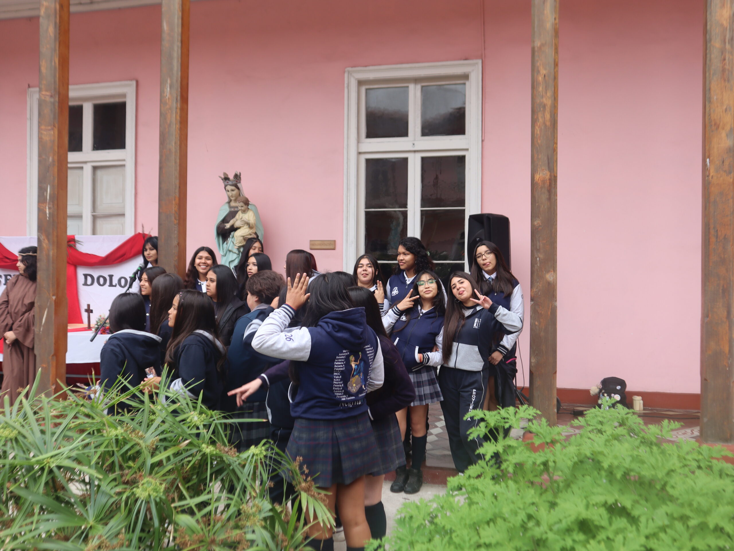 La actividad se desarrolló en distintos espacios del colegio, entre ellos el patio central, el segundo patio, el internado, la capilla, la gruta, el quincho y el salón Bernarda Morín, permitiendo un recorrido simbólico que acompañó cada una de las estaciones.