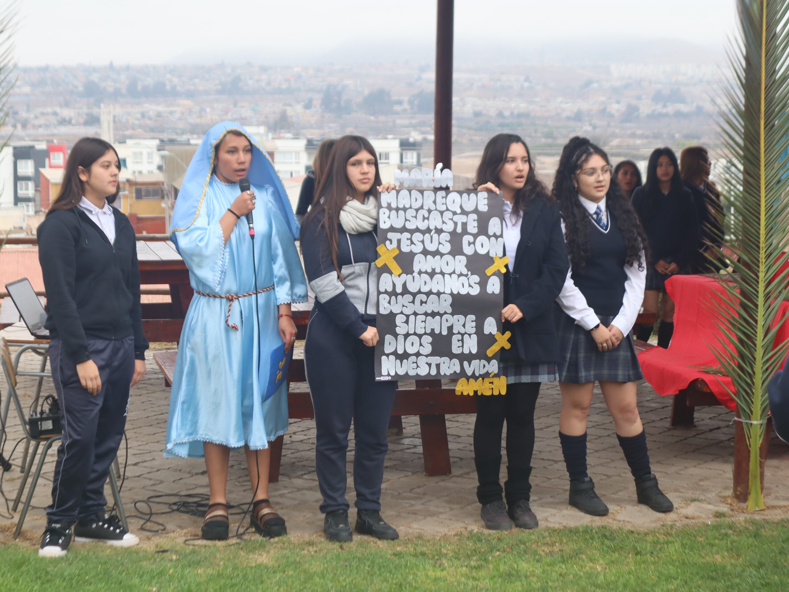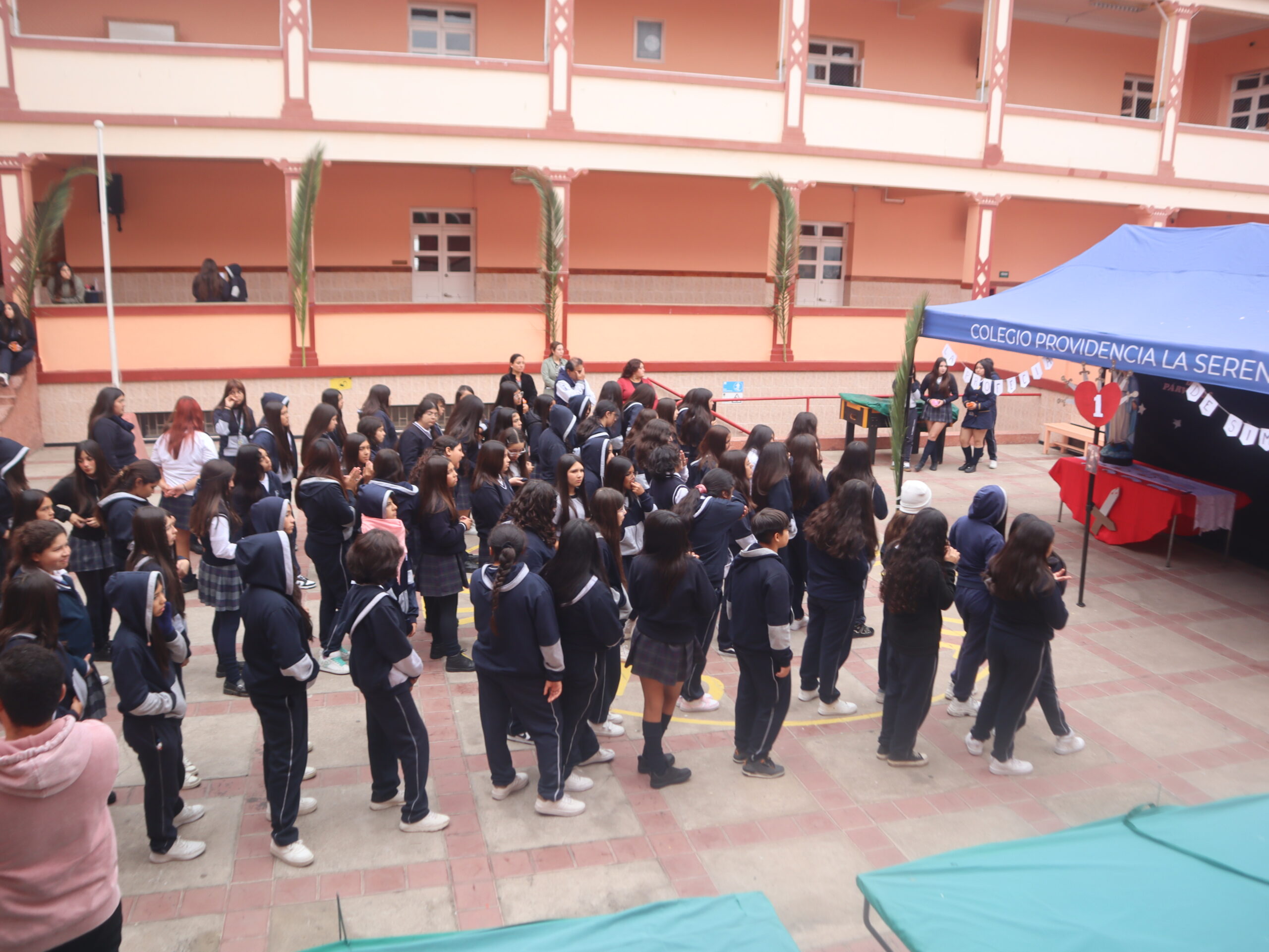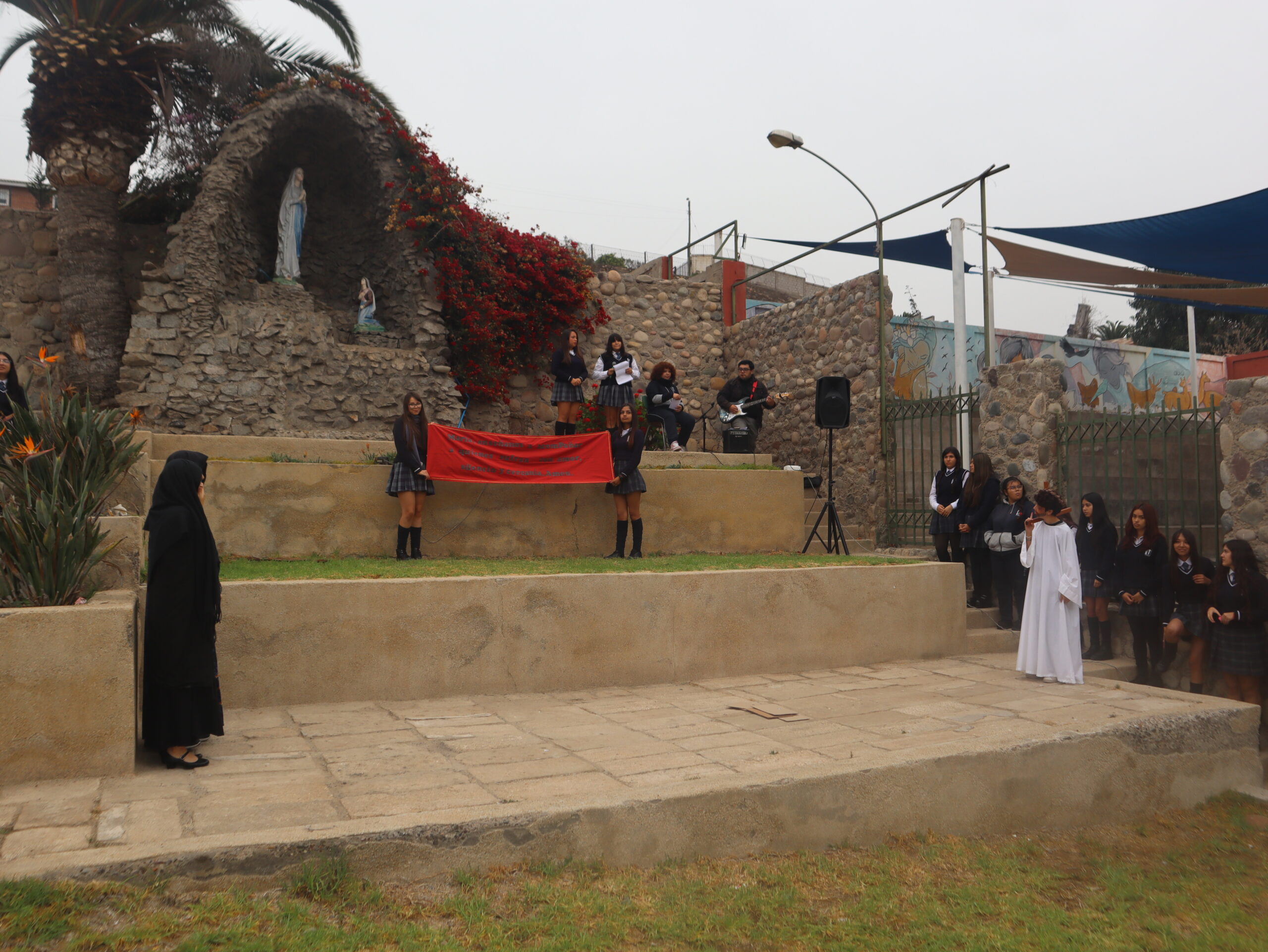 La actividad se desarrolló en distintos espacios del colegio, entre ellos el patio central, el segundo patio, el internado, la capilla, la gruta, el quincho y el salón Bernarda Morín, permitiendo un recorrido simbólico que acompañó cada una de las estaciones.