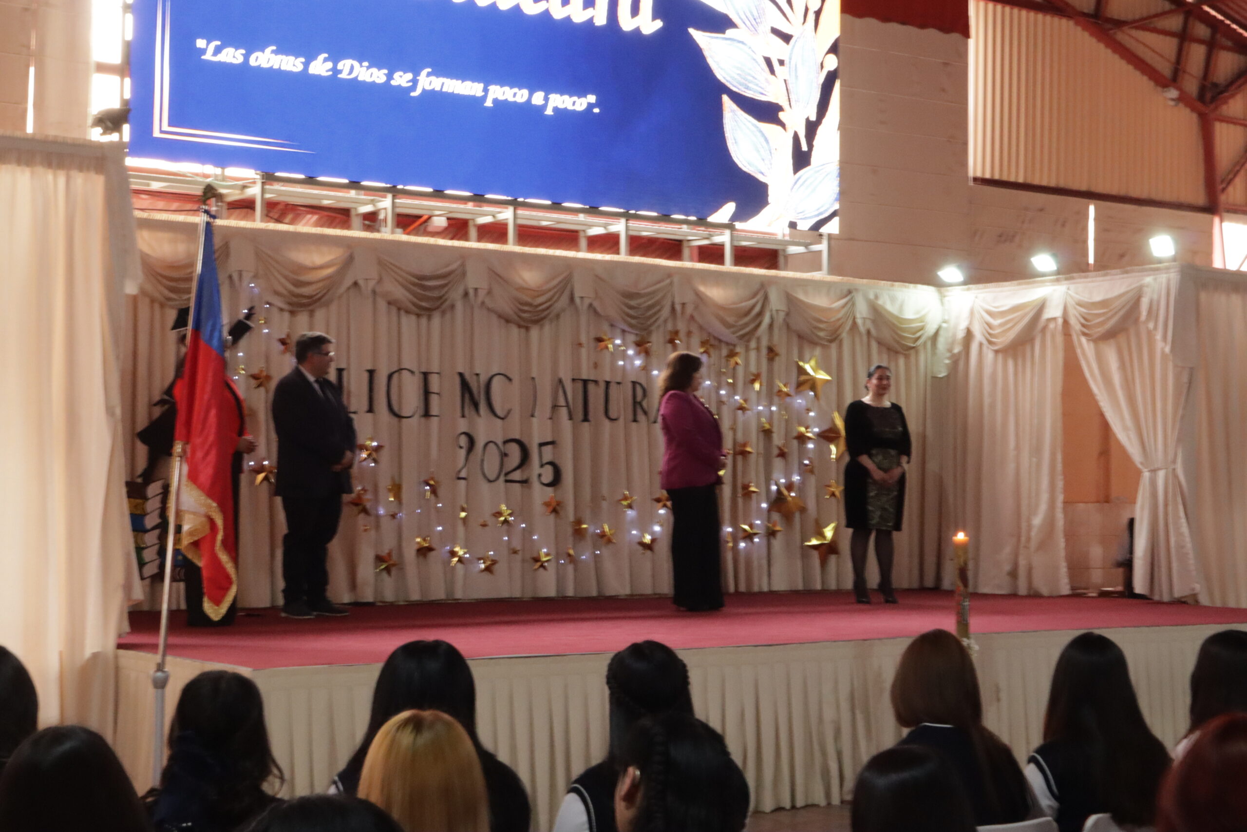 El acto contó con la presencia de autoridades institucionales, entre ellas la Sostenedora Hermana Nancy Arévalo, la Directora Leila Pino, la Inspectora General Claudia Aliaga, además del equipo de gestión, profesores jefes, personal del establecimiento, apoderados y, por supuesto, las protagonistas del día: las alumnas licenciadas.